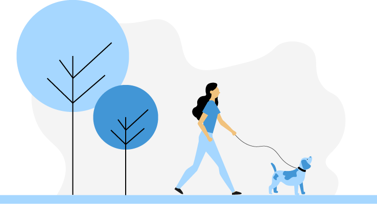 This flat image vector shows a woman walking a dog in an outdoors setting.