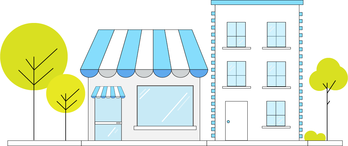 This flat vector image contains a shop and high-rise building in a high street setting.